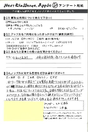 ディーラー下取りが不満足で、どの業者に見積りしてもらおうかとインターネットで評価のよい業者を検索したら、アップルが上位だったので近くのアップルに持込。結果ディーラーより約15%高。店舗も明るくとてもフレンドリーで驚きました。売却後の購入車について、すばらしいアドバイスまでしていただき、満足度120%です。今後も是非利用させていただきます。