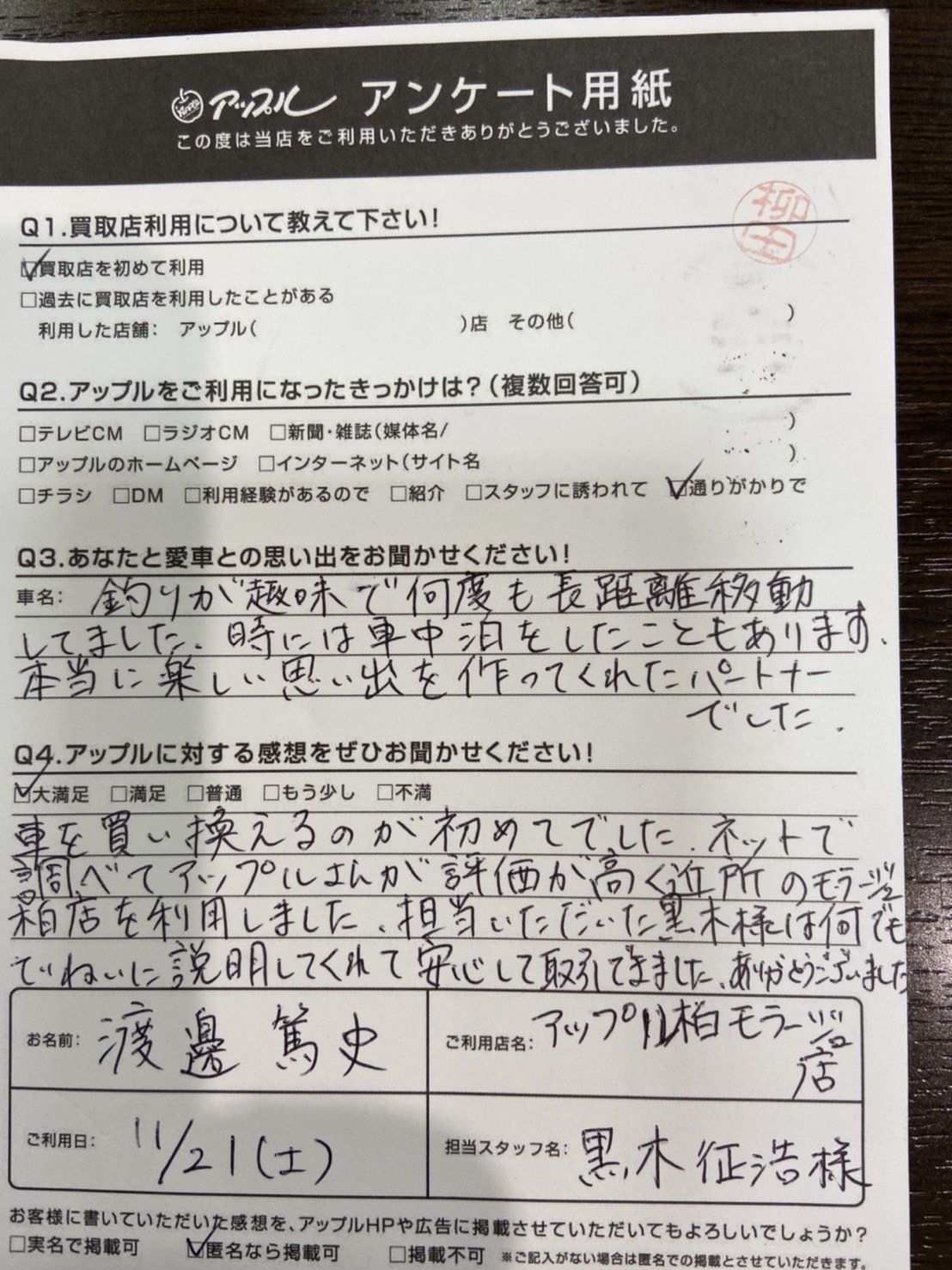 車を買い替えるのが初めてでした、ネットで調べてアップルさんが評価が高く近所のモラージュ柏店を利用しました。担当いただいた黒木さまは何でも丁寧に説明してくれて安心して取引できました。