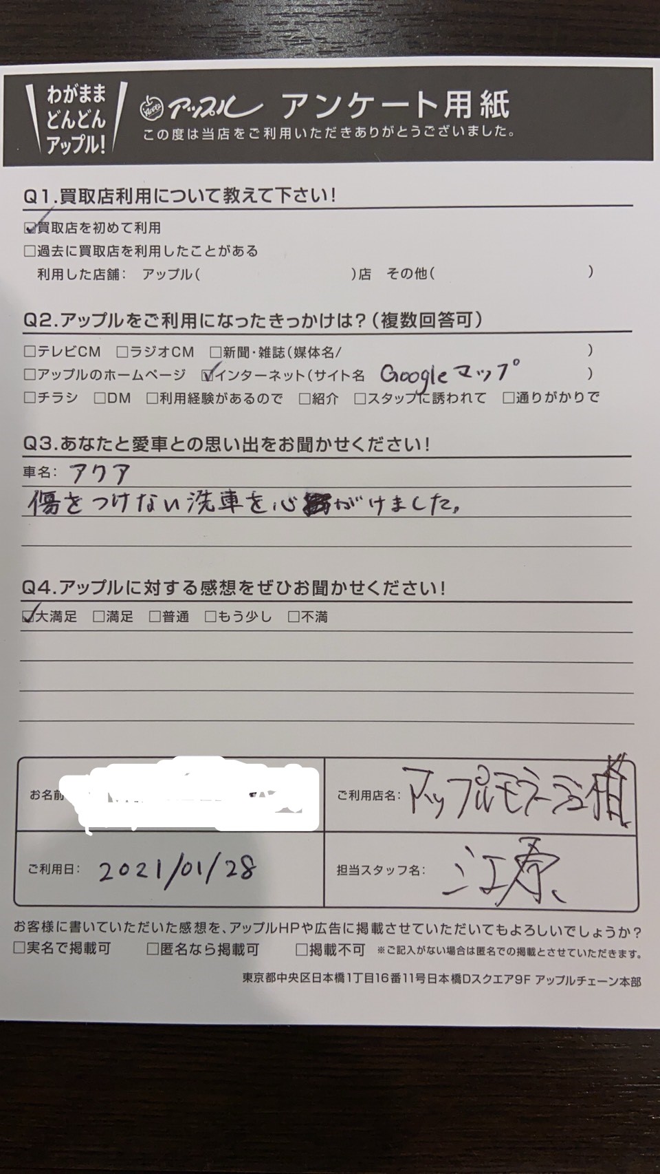 お車のご相談・ 査定だけでもOK! カンタン 入力 30秒 アップルがブランド買取始めました! お電話でも受付中! 受付時間10:00 ~ 19:00 04-7197-4436 お車のご相談・ 査定だけでもOK! カンタン 入力 30秒 アップルがブランド買取始めました! お電話でも受付中! 受付時間10:00 ~ 19:00 04-7197-4436 アップルがブランド買取始めました! お電話でも受付中! 受付時間10:00 ~ 19:00 04-7197-4436 店舗情報 在庫車 スタッフ紹介 ブログ お客様の声 キャンペーン 無料査定 click お客様の声 ご記入日: 2021/01/28 k・k様 車名:トヨタ アクア 傷をつけない洗車を心がけました。 前へ 次へ お客様の声一覧を見る