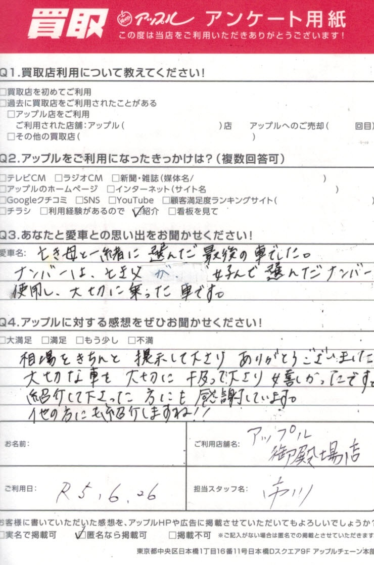 相場をきちんと提示して下さりありがとうございました。大切な車を大切に扱って下さり嬉しかったです。紹介して下さった方にも感謝しています。他の方にも紹介しますね!!