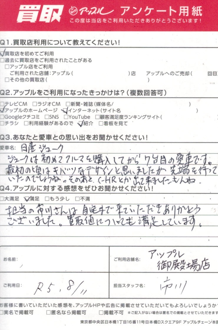 担当の市川さんは自宅まで来ていただきありがとうございました。買取値についても満足しています。