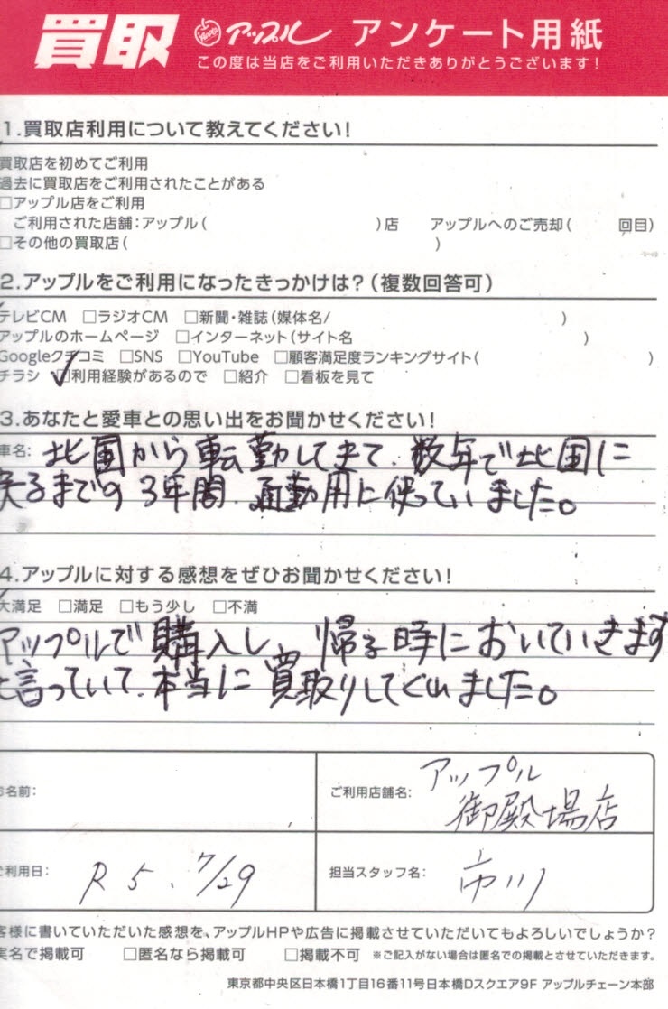 アップルで購入し帰る時においていきますと言っていて、本当に買取してくれました。