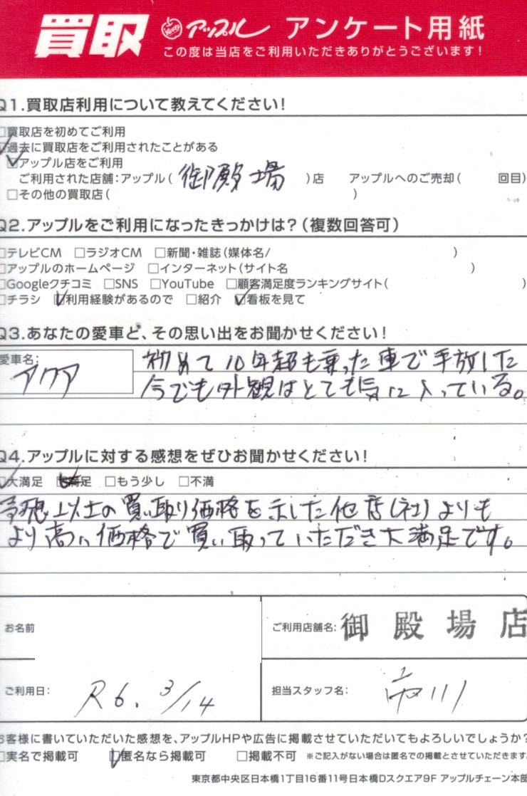 予想以上の買い取り価格を示した他店(社)よりもより高い価格で買い取っていただき大満足です。