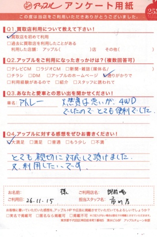 お車のご相談・ 査定だけでもOK! カンタン 入力 30秒 アップルがブランド買取始めました! お電話でも受付中! 受付時間10:00 ~ 18:00 0120-81-3776 お車のご相談・ 査定だけでもOK! カンタン 入力 30秒 アップルがブランド買取始めました! お電話でも受付中! 受付時間10:00 ~ 18:00 0120-81-3776 アップルがブランド買取始めました! お電話でも受付中! 受付時間10:00 ~ 18:00 0120-81-3776 店舗情報 在庫車 スタッフ紹介 ブログ お客様の声 キャンペーン 無料査定 click お客様の声 ご記入日: 2014/11/15 アトレー 買取ご成約 T.Y様 ☆頂きましたアップルに対する感想・・大満足とても親切に対応して頂けました。又、利用したいです。 前へ 次へ お客様の声一覧を見る