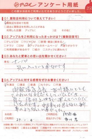 お車のご相談・ 査定だけでもOK! カンタン 入力 30秒 アップルがブランド買取始めました! お電話でも受付中! 受付時間10:00 ~ 18:00 0120-81-3776 お車のご相談・ 査定だけでもOK! カンタン 入力 30秒 アップルがブランド買取始めました! お電話でも受付中! 受付時間10:00 ~ 18:00 0120-81-3776 アップルがブランド買取始めました! お電話でも受付中! 受付時間10:00 ~ 18:00 0120-81-3776 店舗情報 在庫車 スタッフ紹介 ブログ お客様の声 キャンペーン 無料査定 click お客様の声 ご記入日: 2015/01/04 オーパ ご購入 H.T様 ☆頂きましたアップルに対する感想・・大満足御殿場店、店長市川様にとても丁寧な対応をしていただき、自ら信州上田まで運んでいただいたのです。中古車とは思えない新車のようないい車でした。 前へ 次へ お客様の声一覧を見る