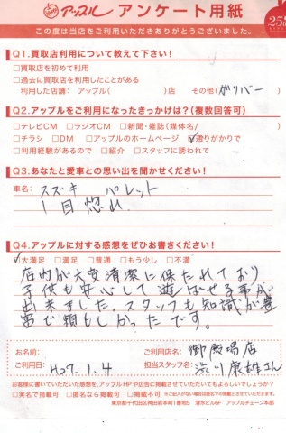 お車のご相談・ 査定だけでもOK! カンタン 入力 30秒 アップルがブランド買取始めました! お電話でも受付中! 受付時間10:00 ~ 18:00 0120-81-3776 お車のご相談・ 査定だけでもOK! カンタン 入力 30秒 アップルがブランド買取始めました! お電話でも受付中! 受付時間10:00 ~ 18:00 0120-81-3776 アップルがブランド買取始めました! お電話でも受付中! 受付時間10:00 ~ 18:00 0120-81-3776 店舗情報 在庫車 スタッフ紹介 ブログ お客様の声 キャンペーン 無料査定 click お客様の声 ご記入日: 2015/01/04 パレットSW ご購入 M.W様 ☆頂きましたアップルに対する感想・・大満足店内が大変清潔に保たれており、子供も安心して遊ばせることが出来ました。スタッフも知識が豊富で頼もしかったです。 前へ 次へ お客様の声一覧を見る