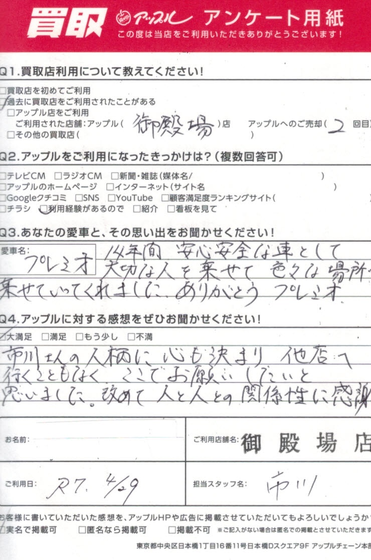 プレミオ買取T・A様 車名:トヨタ プレミオ