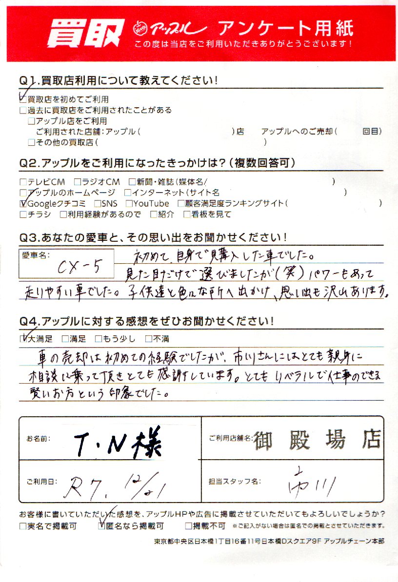 車の売却は初めての経験でしたが、市川さんにはとても親切に相談に乗って頂きとても感謝しています。
