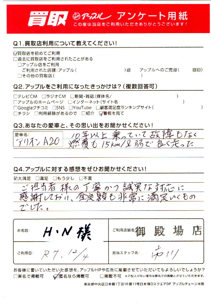 ご担当者様の丁寧かつ誠実な対応に感謝しており、査定額も非常に満足いくものでした。