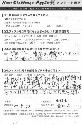 市川さんには車の事や自分自身の問題にも親身になって相談に乗ってもらい、とてもたすかりました。ぜひこれからも良い関係をつづけていきたいと心から思っています。
