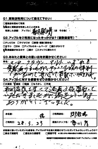 市川店長さまに過去3台買取っていただきましたが満足しています。ありがとうございました。