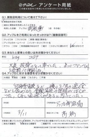 トヨタ コロナ・・大変故障の無い車でした。よってフアンベルトを交換して使用した