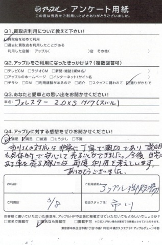市川さんの対応は非常に丁寧で親切であり説明も具体的で安心して売ることが出来ました。今後自宅にある車を売る際には再度利用を考えています。ありがとうございました。
