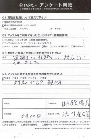 お車のご相談・ 査定だけでもOK! カンタン 入力 30秒 アップルがブランド買取始めました! お電話でも受付中! 受付時間10:00 ~ 18:00 0120-81-3776 お車のご相談・ 査定だけでもOK! カンタン 入力 30秒 アップルがブランド買取始めました! お電話でも受付中! 受付時間10:00 ~ 18:00 0120-81-3776 アップルがブランド買取始めました! お電話でも受付中! 受付時間10:00 ~ 18:00 0120-81-3776 店舗情報 在庫車 スタッフ紹介 ブログ お客様の声 キャンペーン 無料査定 click お客様の声 ご記入日: 2017/05/10 キャリー買取 F.E様 ・あなたと愛車との思い出をお聞かせください運搬に引っ越しに対応してくれました。・アップルに頂きました感想・・大満足対応がよい、親切。担当 渋川 前へ 次へ お客様の声一覧を見る