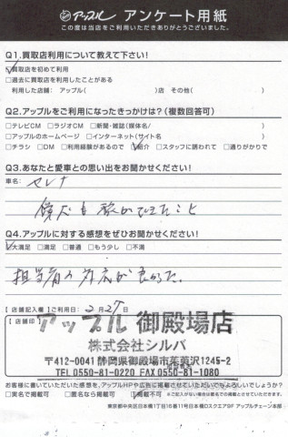 お車のご相談・ 査定だけでもOK! カンタン 入力 30秒 アップルがブランド買取始めました! お電話でも受付中! 受付時間10:00 ~ 18:00 0120-81-3776 お車のご相談・ 査定だけでもOK! カンタン 入力 30秒 アップルがブランド買取始めました! お電話でも受付中! 受付時間10:00 ~ 18:00 0120-81-3776 アップルがブランド買取始めました! お電話でも受付中! 受付時間10:00 ~ 18:00 0120-81-3776 店舗情報 在庫車 スタッフ紹介 ブログ お客様の声 キャンペーン 無料査定 click お客様の声 ご記入日: 2017/02/27 セレナ買取M.A様 ・あなたと愛車との思い出をお聞かせくださいセレナ・・愛犬も旅が出来たこと・アップルに頂きました感想・・大満足担当者の対応がよかった担当 渋川 前へ 次へ お客様の声一覧を見る