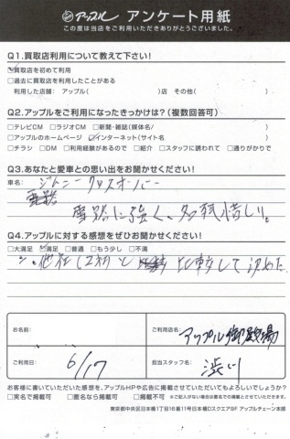 お車のご相談・ 査定だけでもOK! カンタン 入力 30秒 アップルがブランド買取始めました! お電話でも受付中! 受付時間10:00 ~ 18:00 0120-81-3776 お車のご相談・ 査定だけでもOK! カンタン 入力 30秒 アップルがブランド買取始めました! お電話でも受付中! 受付時間10:00 ~ 18:00 0120-81-3776 アップルがブランド買取始めました! お電話でも受付中! 受付時間10:00 ~ 18:00 0120-81-3776 店舗情報 在庫車 スタッフ紹介 ブログ お客様の声 キャンペーン 無料査定 click お客様の声 ご記入日: 2017/06/17 ジムニー買取 I.H様 ・あなたと愛車との思い出をお聞かせくださいジムニー・・雪路に強く、名残惜しい。・アップルに頂きました感想・・満足他社(2社)と比較して決めた。担当 渋川 前へ 次へ お客様の声一覧を見る