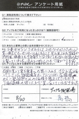 大切に乗ってきた愛車への思い入れを十分に汲み取って下さった御殿場店のカーアドバイザー高橋様から、一発回答+αの価格を提示して頂き、下取り価格の倍以上で買いとって頂きました。
