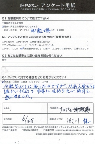 お車のご相談・ 査定だけでもOK! カンタン 入力 30秒 アップルがブランド買取始めました! お電話でも受付中! 受付時間10:00 ~ 18:00 0120-81-3776 お車のご相談・ 査定だけでもOK! カンタン 入力 30秒 アップルがブランド買取始めました! お電話でも受付中! 受付時間10:00 ~ 18:00 0120-81-3776 アップルがブランド買取始めました! お電話でも受付中! 受付時間10:00 ~ 18:00 0120-81-3776 店舗情報 在庫車 スタッフ紹介 ブログ お客様の声 キャンペーン 無料査定 click お客様の声 ご記入日: 2017/06/25 クラウン買取 T.U様 ・アップルに頂きました感想・・大満足10数年ぶりに寄ったのですが以前と変わらず温かい対応で非常に気持ちの良い時間を過ごせました。担当 渋川 前へ 次へ お客様の声一覧を見る