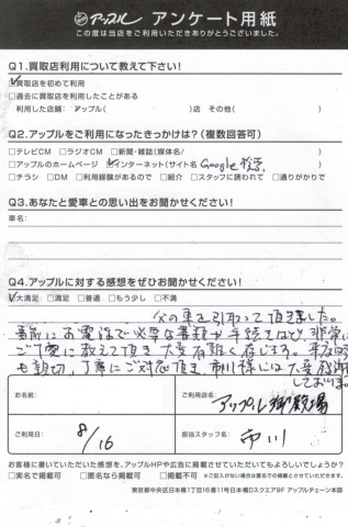 父の車を引き取って頂きました。事前にお電話で必要な書類や手続きなど非常にご丁寧に教えて頂き大変ありがたく存じます。来店時の親切、丁寧にご対応頂き、市川様には大変感謝しております。