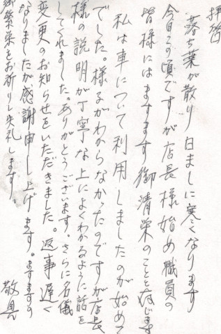 落ち葉が散り日ましに寒くなります今日この頃ですが店長様始め職員の皆様にはますますご清栄のことと存じます。