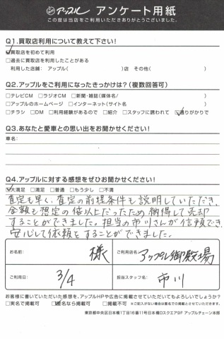 査定も早く、査定の前提条件も説明していただき、金額も想定の倍以上だったため納得して売却することが出来ました。担当の市川さんが信頼でき安心して以来をすることができました。