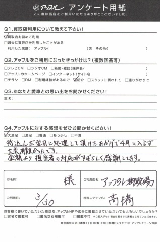 お車のご相談・ 査定だけでもOK! カンタン 入力 30秒 アップルがブランド買取始めました! お電話でも受付中! 受付時間10:00 ~ 18:00 0120-81-3776 お車のご相談・ 査定だけでもOK! カンタン 入力 30秒 アップルがブランド買取始めました! お電話でも受付中! 受付時間10:00 ~ 18:00 0120-81-3776 アップルがブランド買取始めました! お電話でも受付中! 受付時間10:00 ~ 18:00 0120-81-3776 店舗情報 在庫車 スタッフ紹介 ブログ お客様の声 キャンペーン 無料査定 click お客様の声 ご記入日: 2018/03/30 ウイングロード買取 Y.T様 ・アップルに頂きました感想・・大満足持込んだ翌日に処理して頂けたおかげで4月に入らず大変有難かったです。金額より担当者の対応がすばらしく感謝しています。担当 高橋 前へ 次へ お客様の声一覧を見る