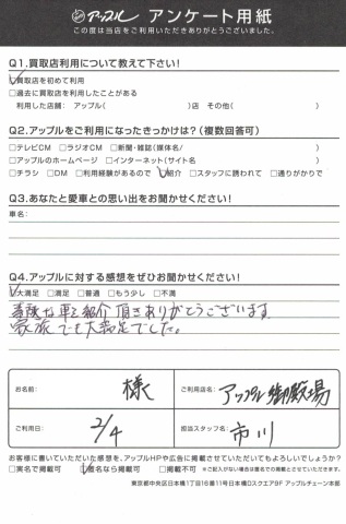 お車のご相談・ 査定だけでもOK! カンタン 入力 30秒 アップルがブランド買取始めました! お電話でも受付中! 受付時間10:00 ~ 18:00 0120-81-3776 お車のご相談・ 査定だけでもOK! カンタン 入力 30秒 アップルがブランド買取始めました! お電話でも受付中! 受付時間10:00 ~ 18:00 0120-81-3776 アップルがブランド買取始めました! お電話でも受付中! 受付時間10:00 ~ 18:00 0120-81-3776 店舗情報 在庫車 スタッフ紹介 ブログ お客様の声 キャンペーン 無料査定 click お客様の声 ご記入日: 2018/02/04 エスティマ購入 D.S様 ・アップルに頂きました感想・・大満足素敵な車を紹介頂きありがとうございます。家族も大満足でした。担当 市川 前へ 次へ お客様の声一覧を見る