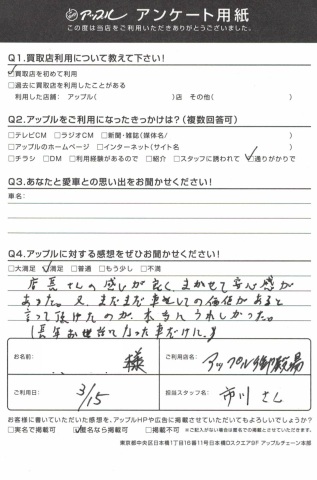 お車のご相談・ 査定だけでもOK! カンタン 入力 30秒 アップルがブランド買取始めました! お電話でも受付中! 受付時間10:00 ~ 18:00 0120-81-3776 お車のご相談・ 査定だけでもOK! カンタン 入力 30秒 アップルがブランド買取始めました! お電話でも受付中! 受付時間10:00 ~ 18:00 0120-81-3776 アップルがブランド買取始めました! お電話でも受付中! 受付時間10:00 ~ 18:00 0120-81-3776 店舗情報 在庫車 スタッフ紹介 ブログ お客様の声 キャンペーン 無料査定 click お客様の声 ご記入日: 2018/03/15 アリオン買取 M.O様 ・アップルに頂きました感想・・満足店長さんの感じが良くまかせて安心感があった。又、まだまだ車として価値があると言って頂けたのが本当にうれしかった。(長年お世話になった車だけに)担当 市川 前へ 次へ お客様の声一覧を見る