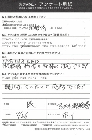 お車のご相談・ 査定だけでもOK! カンタン 入力 30秒 アップルがブランド買取始めました! お電話でも受付中! 受付時間10:00 ~ 18:00 0120-81-3776 お車のご相談・ 査定だけでもOK! カンタン 入力 30秒 アップルがブランド買取始めました! お電話でも受付中! 受付時間10:00 ~ 18:00 0120-81-3776 アップルがブランド買取始めました! お電話でも受付中! 受付時間10:00 ~ 18:00 0120-81-3776 店舗情報 在庫車 スタッフ紹介 ブログ お客様の声 キャンペーン 無料査定 click お客様の声 ご記入日: 2018/04/26 パジェロイオ買取 S.M様 ・あなたと愛車との思い出をお聞かせ下さい御殿場特有の積雪に対応できた!・アップルに頂きました感想・・満足親切、ていねいに対応でした!担当 市川 前へ 次へ お客様の声一覧を見る