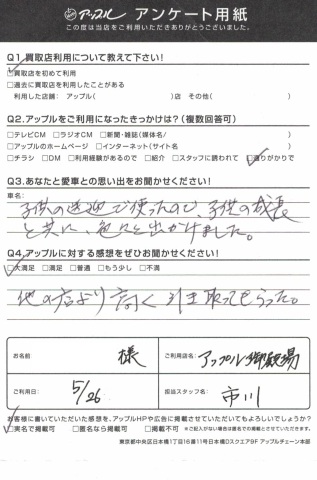 お車のご相談・ 査定だけでもOK! カンタン 入力 30秒 アップルがブランド買取始めました! お電話でも受付中! 受付時間10:00 ~ 18:00 0120-81-3776 お車のご相談・ 査定だけでもOK! カンタン 入力 30秒 アップルがブランド買取始めました! お電話でも受付中! 受付時間10:00 ~ 18:00 0120-81-3776 アップルがブランド買取始めました! お電話でも受付中! 受付時間10:00 ~ 18:00 0120-81-3776 店舗情報 在庫車 スタッフ紹介 ブログ お客様の声 キャンペーン 無料査定 click お客様の声 ご記入日: 2018/05/26 ヴィッツ買取 H.E様 ・あなたと愛車との思い出をお聞かせ下さい子供の送迎で使ったので、子供の成長と共に、色々と出掛けました。・アップルに頂きました感想・・大満足他の店より高く引き取ってもらった。担当 市川 前へ 次へ お客様の声一覧を見る