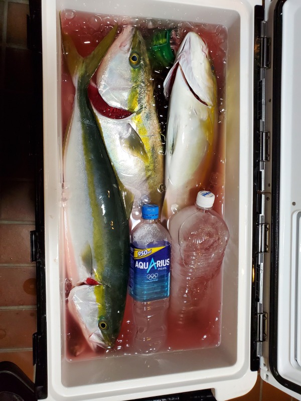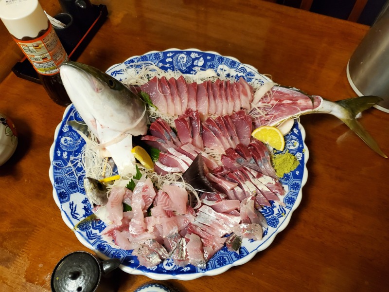 初日には本命のワラサ3匹(ブリの幼魚)やアジ・イサキなど多彩に釣れ、釣った魚で夕飯・晩酌です!旨かった~!