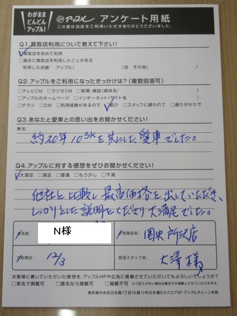 お車のご相談・ 査定だけでもOK! カンタン 入力 30秒 アップルがブランド買取始めました! お電話でも受付中! 受付時間10:00 ~ 19:00(火曜日は18:30までになります) 04-2933-3008 お車のご相談・ 査定だけでもOK! カンタン 入力 30秒 アップルがブランド買取始めました! お電話でも受付中! 受付時間10:00 ~ 19:00(火曜日は18:30までになります) 04-2933-3008 アップルがブランド買取始めました! お電話でも受付中! 受付時間10:00 ~ 19:00(火曜日は18:30までになります) 04-2933-3008 店舗情報 在庫車 スタッフ紹介 ブログ お客様の声 キャンペーン 無料査定 click お客様の声 ご記入日: 2022/01/12 N.H様 車名:スズキ ジムニー 約20年を共にした愛車でした。アップルの感想:大満足他社と比較し最高価格を出していただき、しっかりとした説明をくださり大満足でした。 前へ 次へ お客様の声一覧を見る