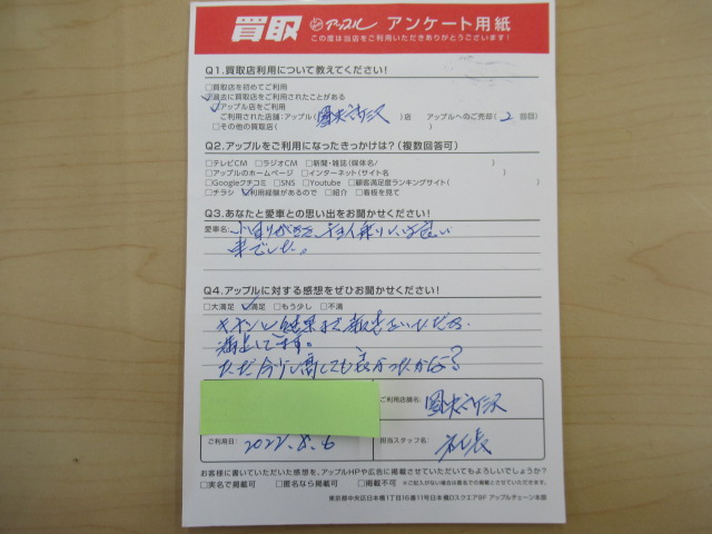 お車のご相談・ 査定だけでもOK! カンタン 入力 30秒 アップルがブランド買取始めました! お電話でも受付中! 受付時間10:00 ~ 19:00(火曜日は18:30までになります) 04-2933-3008 お車のご相談・ 査定だけでもOK! カンタン 入力 30秒 アップルがブランド買取始めました! お電話でも受付中! 受付時間10:00 ~ 19:00(火曜日は18:30までになります) 04-2933-3008 アップルがブランド買取始めました! お電話でも受付中! 受付時間10:00 ~ 19:00(火曜日は18:30までになります) 04-2933-3008 店舗情報 在庫車 スタッフ紹介 ブログ お客様の声 キャンペーン 無料査定 click お客様の声 ご記入日: 2022/08/06 T・K様 小回りがききチョイ乗りには良い車でした。アップルの感想:満足キチンと結果まで報告をいただき満足してます。ただ今少し高くても良かったかな? 前へ 次へ お客様の声一覧を見る