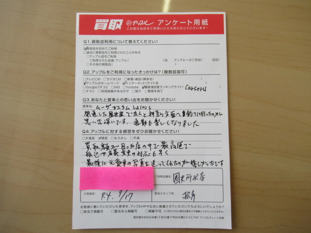 買取額が回った店の中で最高値で振込や名義変更の対応も早く、最後に元愛車の写真を送ってくれたのが嬉しかったです。