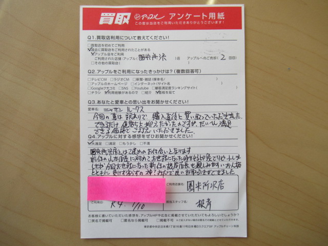 前任の山本店長に初めてお世話になった時が好印象でリピートしましたが、今回お世話になった新任の根岸店長も親しみやすいお人柄とともに負けず劣らずの神?対応で良いお取引ができました。