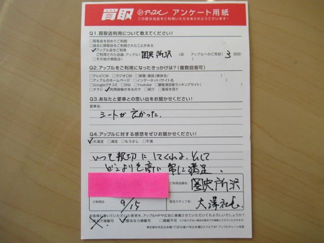 お車のご相談・ 査定だけでもOK! カンタン 入力 30秒 アップルがブランド買取始めました! お電話でも受付中! 受付時間10:00 ~ 19:00(火曜日は18:30までになります) 04-2933-3008 お車のご相談・ 査定だけでもOK! カンタン 入力 30秒 アップルがブランド買取始めました! お電話でも受付中! 受付時間10:00 ~ 19:00(火曜日は18:30までになります) 04-2933-3008 アップルがブランド買取始めました! お電話でも受付中! 受付時間10:00 ~ 19:00(火曜日は18:30までになります) 04-2933-3008 店舗情報 在庫車 スタッフ紹介 ブログ お客様の声 キャンペーン 無料査定 click お客様の声 ご記入日: 2022/09/15 Y様 アップルの感想:大満足いつも親切にしてくれる。そしてどこよりも高い。常に満足。 前へ 次へ お客様の声一覧を見る