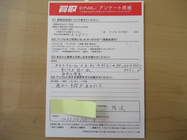お車のご相談・ 査定だけでもOK! カンタン 入力 30秒 アップルがブランド買取始めました! お電話でも受付中! 受付時間10:00 ~ 19:00(火曜日は18:30までになります) 04-2933-3008 お車のご相談・ 査定だけでもOK! カンタン 入力 30秒 アップルがブランド買取始めました! お電話でも受付中! 受付時間10:00 ~ 19:00(火曜日は18:30までになります) 04-2933-3008 アップルがブランド買取始めました! お電話でも受付中! 受付時間10:00 ~ 19:00(火曜日は18:30までになります) 04-2933-3008 店舗情報 在庫車 スタッフ紹介 ブログ お客様の声 キャンペーン 無料査定 click お客様の声 ご記入日: 2022/12/21 T・Y様 カペラ→ルーチェ→ルーチェ→クラウン→オデッセイ→クラウン→クラウン すべてが思い出 自分の歴史アップルの感想:大満足親切に手続きが進みました。 前へ 次へ お客様の声一覧を見る
