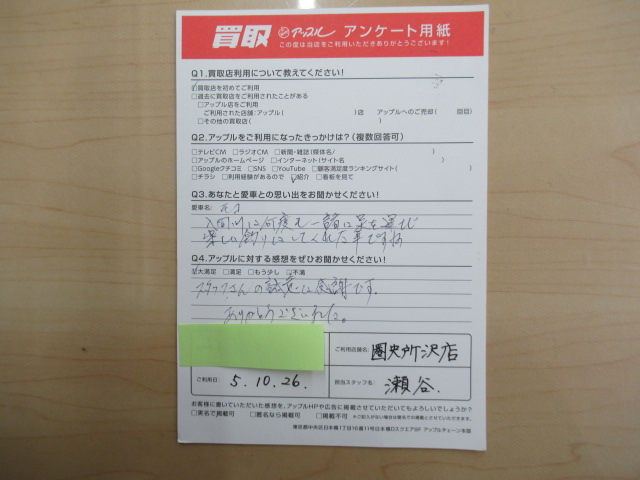 お車のご相談・ 査定だけでもOK! カンタン 入力 30秒 アップルがブランド買取始めました! お電話でも受付中! 受付時間10:00 ~ 19:00(火曜日は18:30までになります) 04-2933-3008 お車のご相談・ 査定だけでもOK! カンタン 入力 30秒 アップルがブランド買取始めました! お電話でも受付中! 受付時間10:00 ~ 19:00(火曜日は18:30までになります) 04-2933-3008 アップルがブランド買取始めました! お電話でも受付中! 受付時間10:00 ~ 19:00(火曜日は18:30までになります) 04-2933-3008 店舗情報 在庫車 スタッフ紹介 ブログ お客様の声 キャンペーン 無料査定 click お客様の声 ご記入日: 2023/10/26 K・M様 車名:日産 モコ 入間川に何度も一緒に足を運び楽しい釣りにしてくれた車ですね。アップルの感想:大満足スタッフさんの誠意には感謝です。ありがとうございました。 前へ 次へ お客様の声一覧を見る