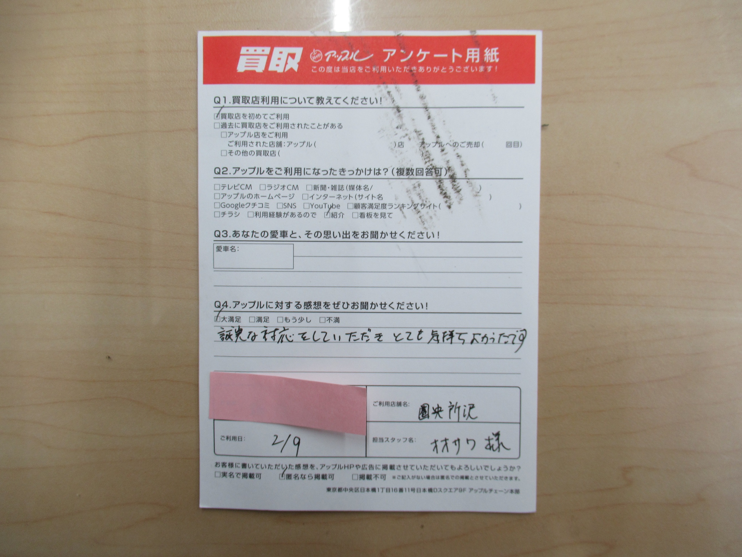 お車のご相談・ 査定だけでもOK! カンタン 入力 30秒 アップルがブランド買取始めました! お電話でも受付中! 受付時間10:00 ~ 19:00(火曜日は18:30までになります) 04-2933-3008 お車のご相談・ 査定だけでもOK! カンタン 入力 30秒 アップルがブランド買取始めました! お電話でも受付中! 受付時間10:00 ~ 19:00(火曜日は18:30までになります) 04-2933-3008 アップルがブランド買取始めました! お電話でも受付中! 受付時間10:00 ~ 19:00(火曜日は18:30までになります) 04-2933-3008 店舗情報 在庫車 スタッフ紹介 ブログ お客様の声 キャンペーン 無料査定 click お客様の声 ご記入日: 2024/02/09 T・I様 アップルの感想:大満足誠実な対応をしていただきとても気持ちよかったです。 前へ 次へ お客様の声一覧を見る