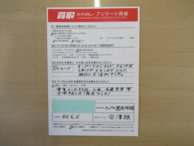 お車のご相談・ 査定だけでもOK! カンタン 入力 30秒 アップルがブランド買取始めました! お電話でも受付中! 受付時間10:00 ~ 19:00(火曜日は18:30までになります) 04-2933-3008 お車のご相談・ 査定だけでもOK! カンタン 入力 30秒 アップルがブランド買取始めました! お電話でも受付中! 受付時間10:00 ~ 19:00(火曜日は18:30までになります) 04-2933-3008 アップルがブランド買取始めました! お電話でも受付中! 受付時間10:00 ~ 19:00(火曜日は18:30までになります) 04-2933-3008 店舗情報 在庫車 スタッフ紹介 ブログ お客様の声 キャンペーン 無料査定 click お客様の声 ご記入日: 2024/06/06 M・A様 車名:ダイハツ コペン オープンでのドライブ、クローズはトランクが大きいのでゴルフ、旅行に大活躍でした。アップルの感想:大満足営業マンの対応、入金、名義変更等不安もなく大満足でした! 前へ 次へ お客様の声一覧を見る