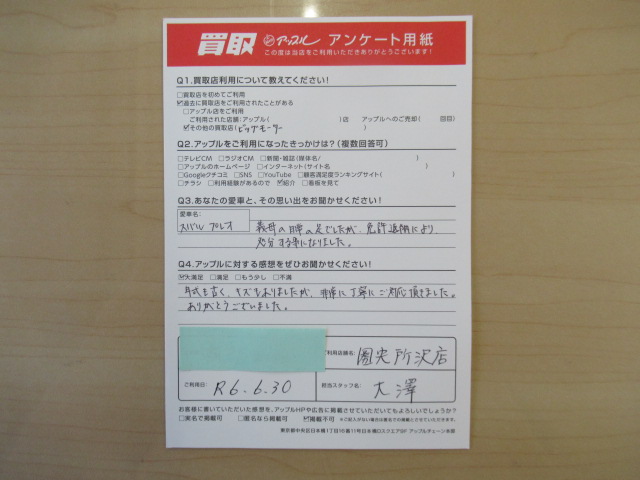 お車のご相談・ 査定だけでもOK! カンタン 入力 30秒 アップルがブランド買取始めました! お電話でも受付中! 受付時間10:00 ~ 19:00(火曜日は18:30までになります) 04-2933-3008 お車のご相談・ 査定だけでもOK! カンタン 入力 30秒 アップルがブランド買取始めました! お電話でも受付中! 受付時間10:00 ~ 19:00(火曜日は18:30までになります) 04-2933-3008 アップルがブランド買取始めました! お電話でも受付中! 受付時間10:00 ~ 19:00(火曜日は18:30までになります) 04-2933-3008 店舗情報 在庫車 スタッフ紹介 ブログ お客様の声 キャンペーン 無料査定 click お客様の声 ご記入日: 2024/06/30 K・A様 車名:スバル プレオ 義母の日常の足でしたが、免許返納により処分する事になりました。アップルの感想:大満足年式も古く、キズもありましたが、非常に丁寧にご対応頂きました。ありがとうございました。 前へ 次へ お客様の声一覧を見る