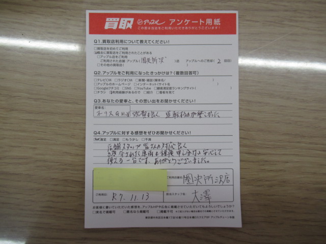 お車のご相談・ 査定だけでもOK! カンタン 入力 30秒 アップルがブランド買取始めました! お電話でも受付中! 受付時間10:00 ~ 19:00(火曜日は18:30までになります) 04-2933-3008 お車のご相談・ 査定だけでもOK! カンタン 入力 30秒 アップルがブランド買取始めました! お電話でも受付中! 受付時間10:00 ~ 19:00(火曜日は18:30までになります) 04-2933-3008 アップルがブランド買取始めました! お電話でも受付中! 受付時間10:00 ~ 19:00(火曜日は18:30までになります) 04-2933-3008 店舗情報 在庫車 スタッフ紹介 ブログ お客様の声 キャンペーン 無料査定 click お客様の声 ご記入日: 2025/11/13 M・Y様 車名:トヨタ オーリス 燃費も良く、運転するのが楽しかったアップルの感想:大満足店舗スタッフ皆さんの対応良く紹介された車両も程度申し分ない安心して使える一台です。ありがとうございました。 前へ 次へ お客様の声一覧を見る
