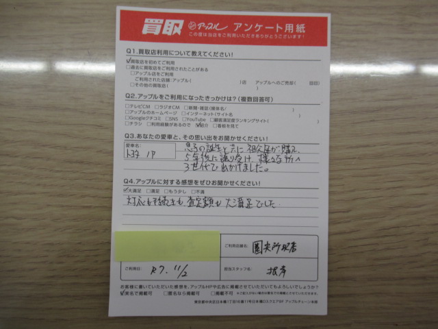 お車のご相談・ 査定だけでもOK! カンタン 入力 30秒 アップルがブランド買取始めました! お電話でも受付中! 受付時間10:00 ~ 19:00(火曜日は18:30までになります) 04-2933-3008 お車のご相談・ 査定だけでもOK! カンタン 入力 30秒 アップルがブランド買取始めました! お電話でも受付中! 受付時間10:00 ~ 19:00(火曜日は18:30までになります) 04-2933-3008 アップルがブランド買取始めました! お電話でも受付中! 受付時間10:00 ~ 19:00(火曜日は18:30までになります) 04-2933-3008 店舗情報 在庫車 スタッフ紹介 ブログ お客様の声 キャンペーン 無料査定 click お客様の声 ご記入日: 2025/11/02 川島 聡生様 車名:トヨタ ノア 息子の誕生と共に祖父母が購入。5年後に譲り受け様々な所へ3世代で出かけました。アップルの感想:大満足対応も手続きも査定額も大満足でした。 前へ 次へ お客様の声一覧を見る
