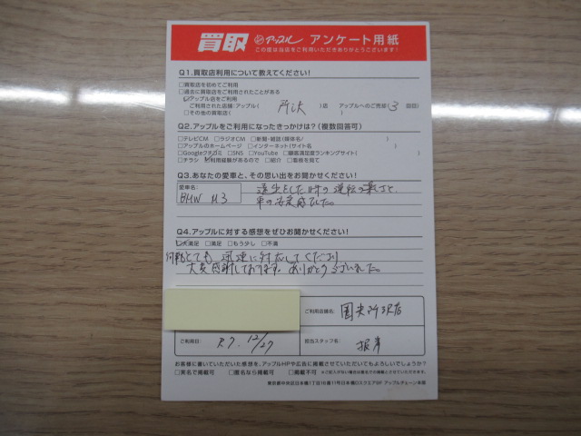 お車のご相談・ 査定だけでもOK! カンタン 入力 30秒 アップルがブランド買取始めました! お電話でも受付中! 受付時間10:00 ~ 19:00(火曜日は18:30までになります) 04-2933-3008 お車のご相談・ 査定だけでもOK! カンタン 入力 30秒 アップルがブランド買取始めました! お電話でも受付中! 受付時間10:00 ~ 19:00(火曜日は18:30までになります) 04-2933-3008 アップルがブランド買取始めました! お電話でも受付中! 受付時間10:00 ~ 19:00(火曜日は18:30までになります) 04-2933-3008 店舗情報 在庫車 スタッフ紹介 ブログ お客様の声 キャンペーン 無料査定 click お客様の声 ご記入日: 2025/12/27 S・N様 車名:BMW M3 遠出をした時の運転の楽しさと車の安定感でした。アップルの感想:大満足何事もとても迅速に対応してくださり大変感謝しております。ありがとうございました。 前へ 次へ お客様の声一覧を見る