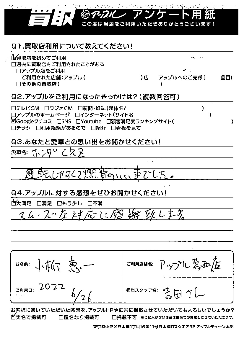 買取店を初めてご利用 ご愛車:ホンダ CRZ 担当:吉田