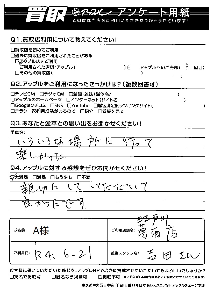 お車のご相談・ 査定だけでもOK! カンタン 入力 30秒 アップルがブランド買取始めました! お電話でも受付中! 受付時間営業時間:9:00-18:00 0120-959-955 お車のご相談・ 査定だけでもOK! カンタン 入力 30秒 アップルがブランド買取始めました! お電話でも受付中! 受付時間営業時間:9:00-18:00 0120-959-955 アップルがブランド買取始めました! お電話でも受付中! 受付時間営業時間:9:00-18:00 0120-959-955 店舗情報 在庫車 スタッフ紹介 ブログ お客様の声 キャンペーン お得 無料査定 click お客様の声 ご記入日: 2022/07/17 A様 ご利用日:2022/6/21 A 様 担当:吉田Q アップルをご利用になったきっかけは?A 利用経験があるので Q あなたと愛車の思い出をお聞かせください!A いろいろな場所に行って楽しかった。Q アップルに対する感想をぜひお聞かせください!A 大満足 親切にしていただいて良かったです。 前へ 次へ お客様の声一覧を見る