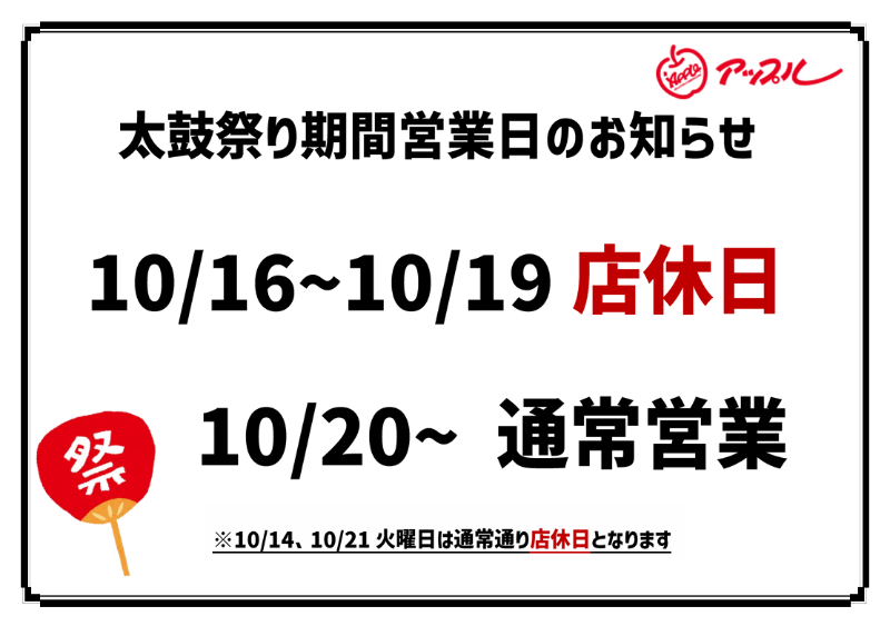 地方祭開催につき、10/16~10/19を店休日とさせていただきます。