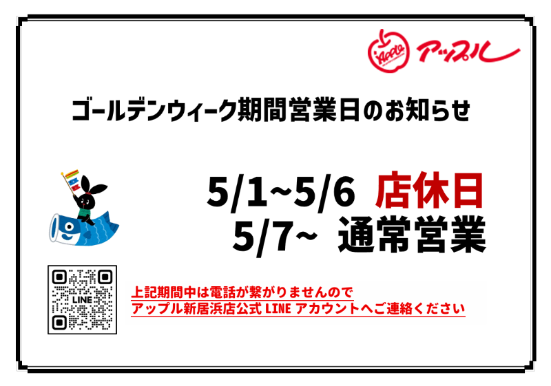 アップル新居浜では、5/1~5/6日の間をGW休業とさせていただきます。