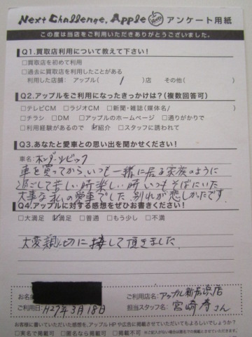 お車のご相談・ 査定だけでもOK! カンタン 入力 30秒 アップルがブランド買取始めました! お電話でも受付中! 受付時間10:00 ~ 19:00 0897-65-1880 お車のご相談・ 査定だけでもOK! カンタン 入力 30秒 アップルがブランド買取始めました! お電話でも受付中! 受付時間10:00 ~ 19:00 0897-65-1880 アップルがブランド買取始めました! お電話でも受付中! 受付時間10:00 ~ 19:00 0897-65-1880 店舗情報 在庫車 スタッフ紹介 ブログ お客様の声 キャンペーン お得 無料査定 click お客様の声 ご記入日: 2015/03/18 Y.A様 大変親切に接して頂きました。 前へ 次へ お客様の声一覧を見る
