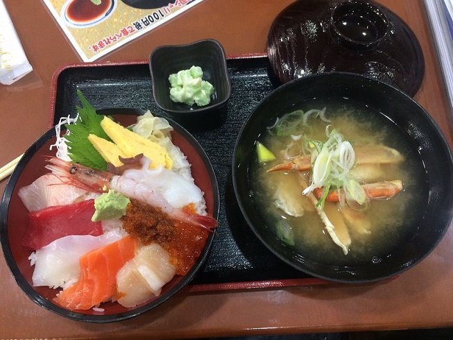 買い物に付き合ってもらった相棒と昼食に海鮮丼!!(カニ汁、ワサビカズノコ付き)